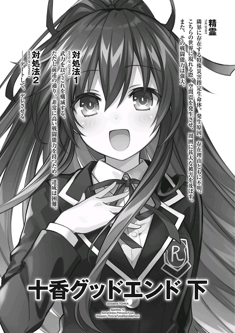 精灵,在故事中,是人性异化的具象。无论是澪与十香这样的“纯种”精灵,还是其他由人类化成的精灵,都背负着扭曲的罪与罚的枷锁。每一位精灵,皆是自欲望与恐惧之中诞生:韦斯特考特等人的欲念孕育出始源精灵,而后者对爱的欲望与死的恐惧,又使得她亵渎生命、制造出其他的精灵。正如象征生命的Kabbalah反面是通向灭亡的Qlipoth,精灵们有着少女一般的美好,也藏着深邃的黑暗。若说人性善集中通过士道等人表现,人性恶则是集中通过她们来表现。而在这之中,唯有十香这个角色拥有独一无二的特殊性。她是澪无意识下的造物,故而没有背负欲孽的原罪,却成了不折不扣的异类而被抛弃,只得孤独地彷徨。她纯净得如同一块白板,又如同一面镜子,映照出他人内心的投影。被人抱以敌意攻击时,她显得冷酷而孤傲;被士道用爱感化并接纳后,则表现出天真无邪的性情。作为她反面的天香则如同黑板,看似不同,实则与她表里一体(好比双面的黑白板)。在平行世界中,她夺走所有的天使、化为骇人恶兽,等于背负下精灵的所有罪孽;而在假想世界中,她则是手握金银双剑的美丽公主,牺牲己身换来拯救世界。作者赋予她的地位,如同婆罗门教的原人、《圣经》中的耶稣基督。读者心中最喜爱的女主角或许有所不同,但从这个意义上我可以断言,十香是本作最为脱颖而出的一位女主角(K君本人也最喜欢十香)。这样的一位角色,在樱花盛开的春天迎来复活(基督教的复活节恰巧在每年四月十日前后),可以说是意料之中,作为结局也为系列画上了一个完满的句号。