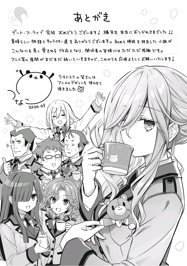 恭喜《Date·A·Live》完结!非常感谢橘老师!!感谢您书写了美妙的故事和角色们。我第一次负责插画的小说竟然变成了这么一部可爱的长篇作品,在此对相关方面表达无尽的谢意。因为之后还有动画等企划,希望大家之后也能继续应援本系列!