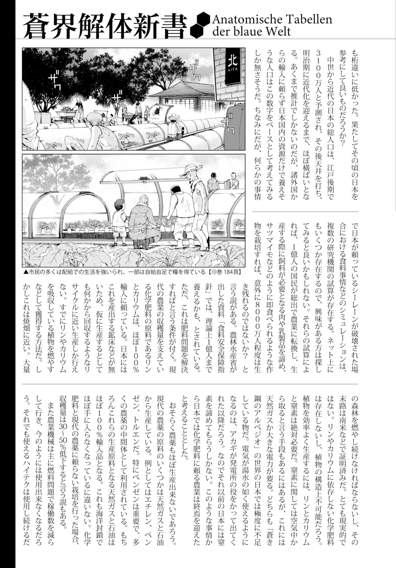 总之,为了高效地生产植物,氮、磷、钾是绝对必不可少的。关于氮,虽然确实存在从空气中提取的手段,但这需要消耗天然气和巨量的电力,这两者对于《苍蓝钢铁的琶音》世界观下的日本而言,都是极度匮乏的资源。想要像流水一般挥霍电力,那大概要等到赤城自告奋勇充当发电站之后;在那之前的日本则只能放弃生产氮肥的想法了。综上所述,可以认为在日本,依赖化肥的农业已经走向了终结。
