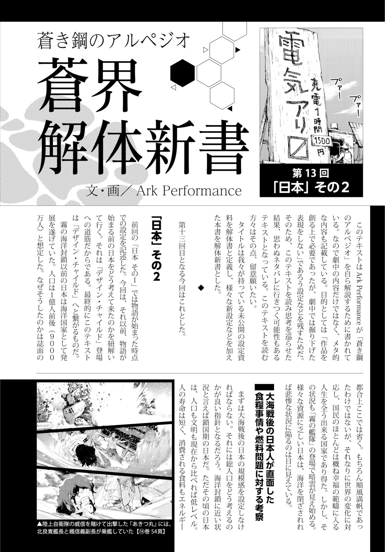 这段文字是Ark Performance为了自己解说《苍蓝钢铁的琶音》的剧情而写的,其中不仅包括剧情内容,同时也会有一些meta的内容,目的是记录下「在创作方面必须要有,不过剧情上不会深入挖掘」这样的剧情设定。因此,读者读完这段文字之后,思考可能不经意间就会命中后面的剧情,导致自己剧透自己。阅读的时候对此还请留意。