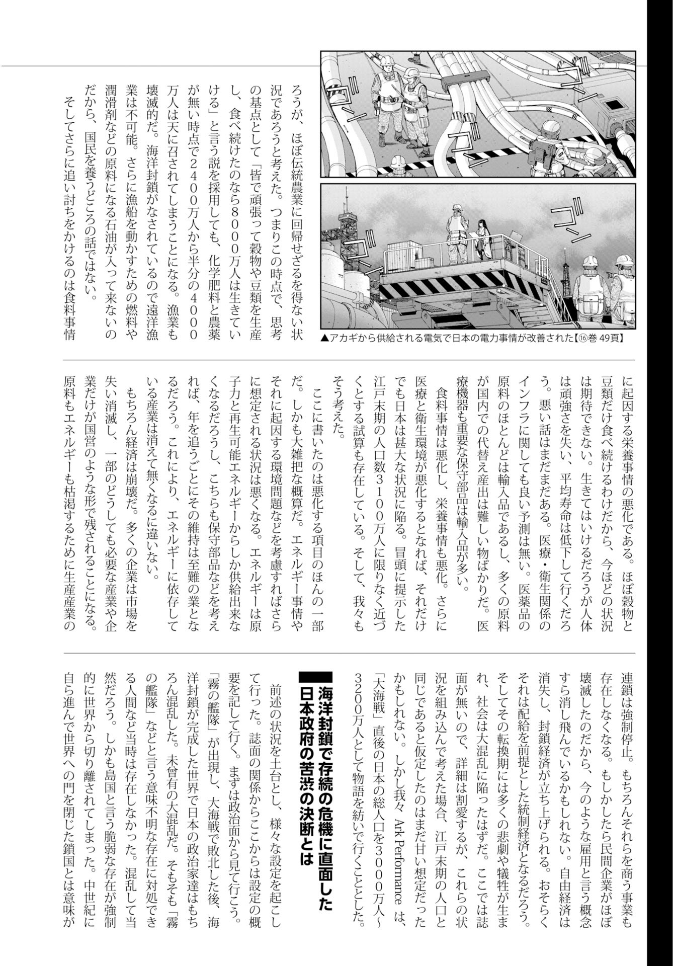 当然,经济会随之崩坏。大量企业会因市场消失而灭亡,只剩下一部分确实必要的产业或企业,以国营的形式苟延残喘。原料和能源的枯竭导致制造业的链条停止运转,做这些生意的企业当然也就不复存在。说不定由于民间企业几乎全灭,连如今的“雇佣”这一概念都会随之消亡。自由经济消失,封锁下的经济体制抬头,想必那是以配给制为前提的计划经济体制。转型期间将产生无数的悲剧和牺牲,社会恐怕也将陷入巨大的混乱。这里也因为版面限制,详细描写不得不略去,但总之,结合这些情况考虑,假设那时的日本能维持和江户末期相当的人口,实际上说不定非常天真。不过,我们Ark Performance最终还是将「大海战」后的日本人口设定为3000~3200万人,以此为基础来展开故事。